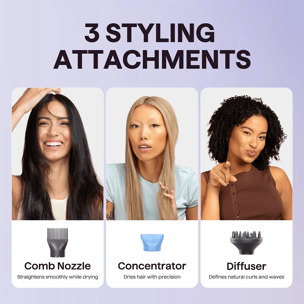 Prepare to be blown away by this high-powered hair dryer. Pick from 3 temps and 3 attachments for every hair type: a concentrated nozzle for precision airflow and targeted styling, a diffuser for fighting frizz and enhancing curls, and a comb that helps straighten thick, unruly hair. Powered by an 1875-watt motor (aka supercharged), it dries hair 2X faster by boosting airflow and rapidly reducing moisture — meaning less time, less heat, and less damage. Negative ions work to reduce frizz and increase shine, while our double-layer removable filter prevents hair from getting caught or tangled inside. Compact and featherlight, it’s perfect for on-the-go styling. Lock in your look with a cool-shot for a long-lasting, super-smooth finish. What can’t this dryer do?